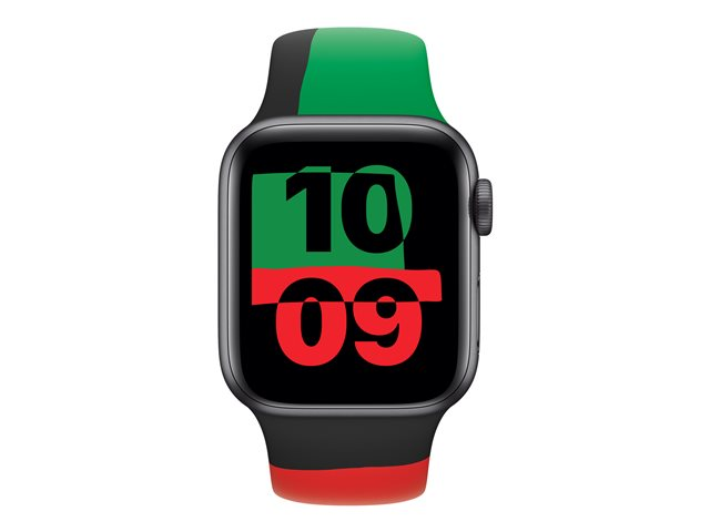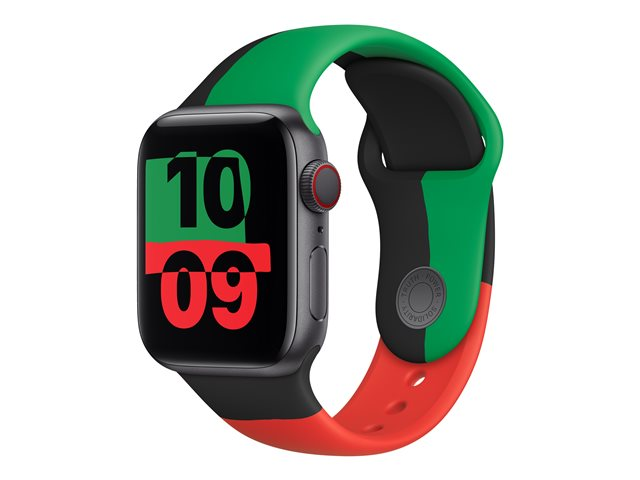 Black Unity Sport Band er designet av svarte kreatører og allierte i Apple for å hedre og sette søkelyset på svart historie og kultur. Remmen er inspirert av fargene i det panafrikanske flagget og hyller håndverkstradisjonen med quilting. Tre separate deler av farget fluorelastomer settes sammen for hånd og blir deretter formstøpt og presset sammen til en rem. Remmen kompletteres av den dynamiske urskiven Samhold, som viser et mønster av asymmetriske former som endrer seg når Apple Watch er i bevegelse, og fargene blir satt sammen til et unikt billedvev. Den har en nyskapende låsepinne med lasergraveringen "Truth. Power. Solidarity. "