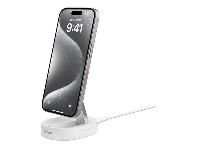 Produktbeskrivelse Belkin BoostCharge Pro trådløst ladestativ - magnetisk - + AC-strømadapter - 15 watt Produkttype Trådløst ladestativ + AC-strømadapter Utformet for Mobiltelefon Dimensjoner (BxDxH) 6.564 cm x 8.652 cm Farge Hvit Trådløs lading Ja Trådløs ladestanarder Qi2 Strømtilførsel 15 watt Kabler USB-C-kabel - 1.5 m Produktgjenvinningsinnhold Laget av resirkulert etter-forbrukerplast -
