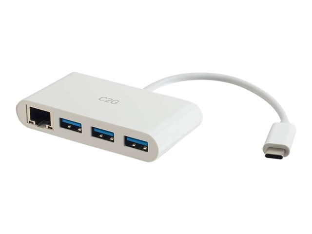 | Produktbeskrivelse | C2G USB C Ethernet and 3 Port USB Hub White - Hub - 3 Ports - nettverksadapter - USB-C - Gigabit Ethernet x 1 + USB 3.0 x 3 |