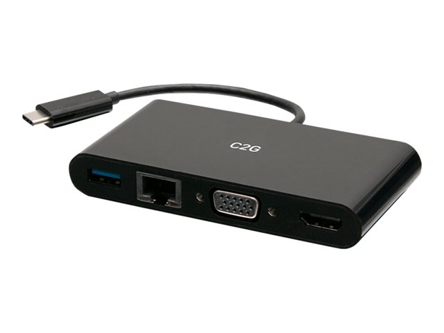 Produktbeskrivelse C2G USB C to HDMI, VGA, USB A, Ethernet Adapter - 4K 30Hz - Black - dokkingstasjon - USB-C / Thunderbolt 3 - HDMI, VGA - 1GbE Produkttype Dokkingstasjon Dokkegrensesnitt USB-C / Thunderbolt 3 Videogrensesnitt HDMI, VGA Dimensjoner (BxDxH) 10.3 cm x 5.2 cm x 1.55 cm Vekt 31.8 g Farge Svart Nettverkstilknytning Gigabit Ethernet Fabrikantgaranti 1-årsgaranti -