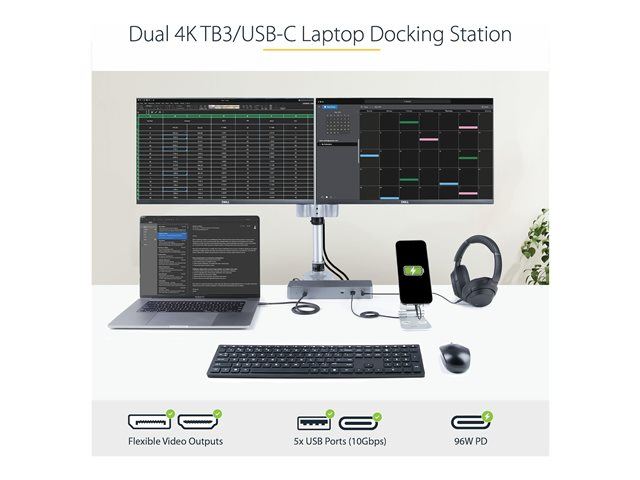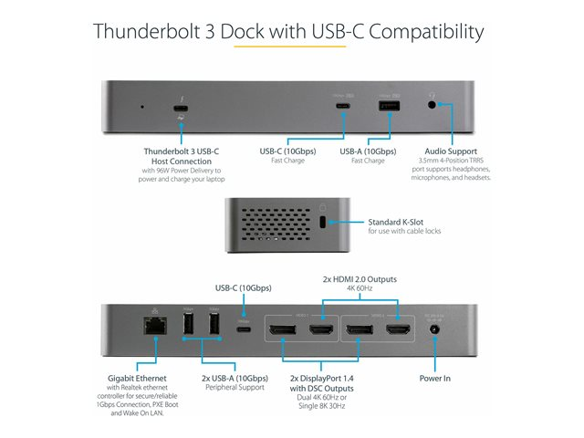 StarTech.com Thunderbolt 3 Dock with USB-C Host Compatibility, Dual 4K 60Hz DisplayPort 1.4 or Dual HDMI 2.0 Monitors, Single 8K, TB3/USB-C Laptop Docking Station, 96W PD, 5x USB, 10Gbps