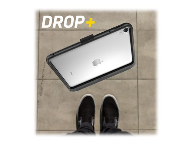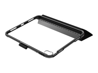 Symmetry Series Folio clear folio case protects your tablet against drops, and its clear back makes it easy to identify engravings and asset tags. The microfiber folio lining guards the screen an elastic band holds it closed. The folio quickly converts into two positions for typing and viewing. Plus, the case stays put on slick surfaces thanks to no-skid rubber feet.