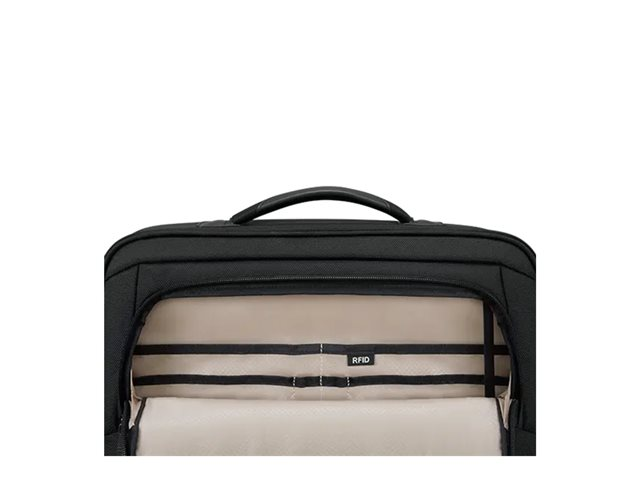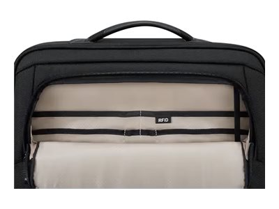 - Main compartment features a full workstation and storage pockets for accessories and other small items, including RFID blocking pocket and key fob