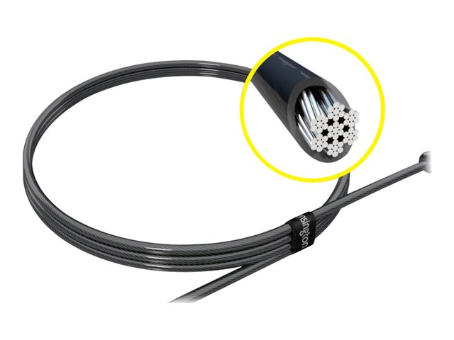 - 2.4m (8-foot) carbon steel cable is cut-resistant and anchors to desk, table or any fixed structure